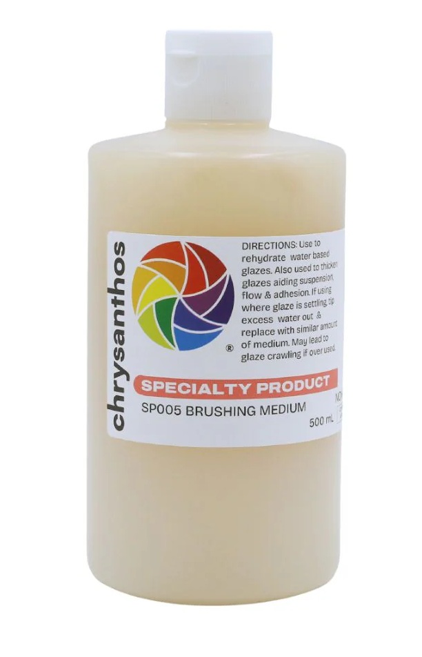 Chrysanthos Color Co. Ltd. Brushing Medium can also be used to temporarily help reconstitute liquid glazes that have fallen out of suspension (ie. glazes that have separated).