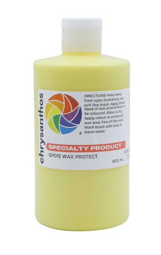 Chrysanthos Color Co. Ltd. Wax Protect is a paintable water based wax emulsion used for selective decoration. It works by repelling underglaze or glaze colours that are applied over it (ie. the wax covers those areas not to be decorated). The wax is then fired off.